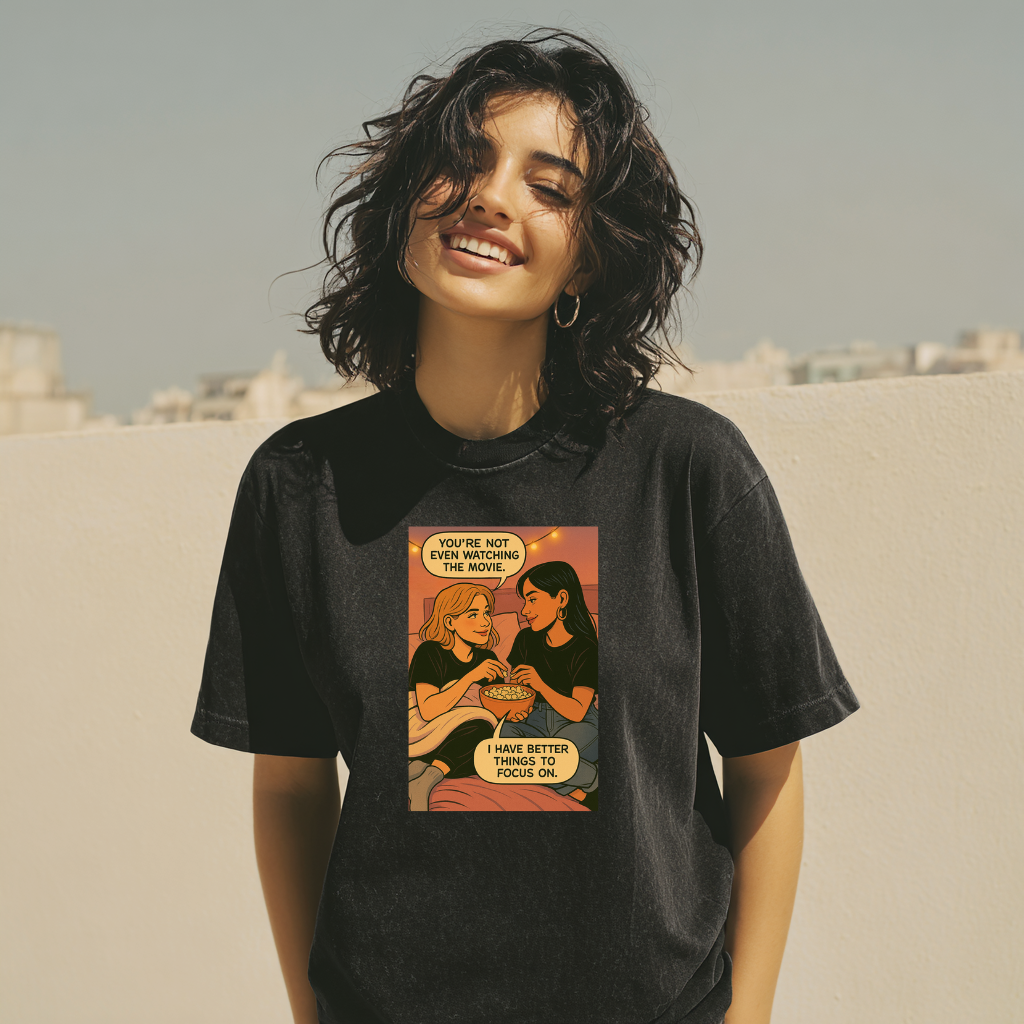This tee captures that cozy kind of closeness — when the lights are low, the popcorn’s half-eaten, and the tension is anything but subtle. Printed on our signature acid-washed black cotton, it’s soft, oversized, and made for movie nights that turn into something else.