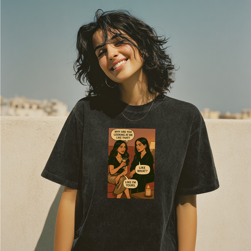 This tee holds that slow, vulnerable pull — the moment when everything is unspoken but completely clear. Printed on our signature acid-washed black cotton, it’s soft, oversized, and made for getting caught in the gaze.