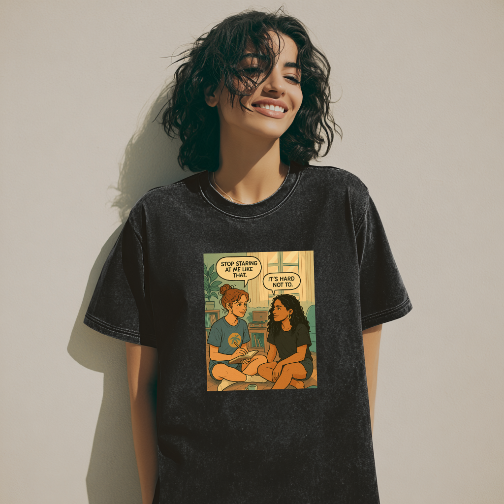 This tee lives in the tension — that flirty moment when neither of you is backing down. Printed on our signature acid-washed black cotton, it’s soft, breathable, and made to be noticed. The oversized drop-shoulder fit gives it a lived-in feel with just enough edge. Wear it when you want to start something.