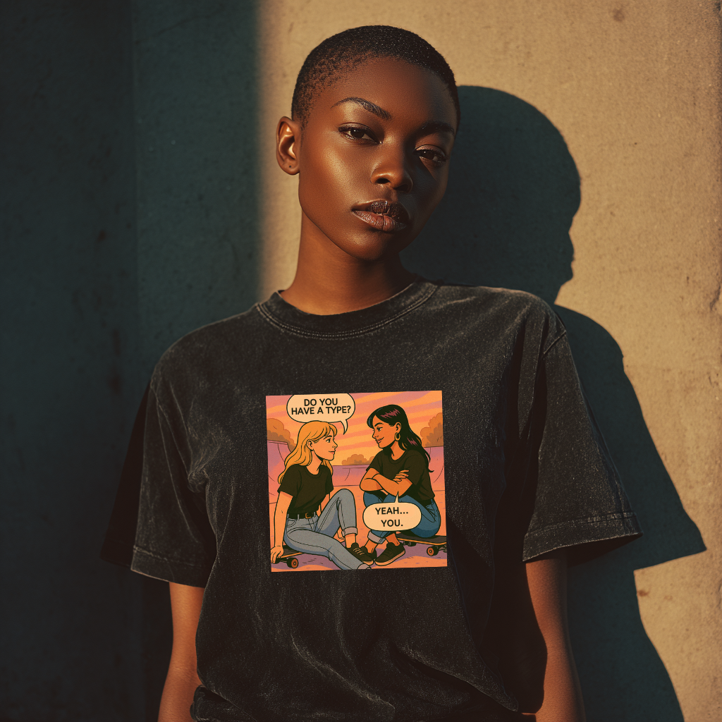 Printed on our signature acid-washed black cotton, this tee delivers the kind of energy that doesn’t play coy. With a soft, oversized fit and vintage feel, it’s perfect for when you want to be comfy, cute, and just a little dangerous.