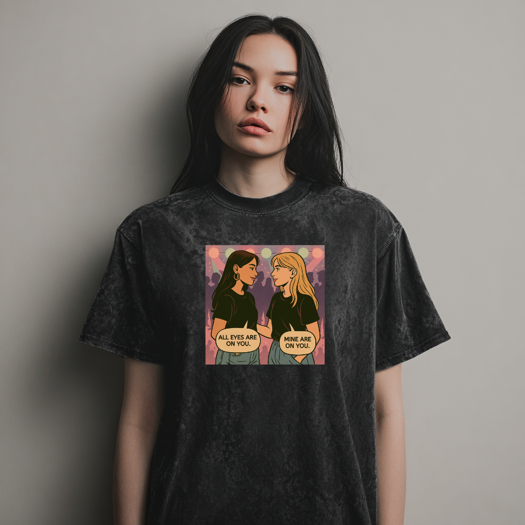 This tee captures that exact moment — the pause, the glance, the spark. Printed on our signature acid-washed black cotton, it’s soft, breathable, and built for all-day (and all-night) wear. The oversized drop-shoulder fit gives it effortless edge, while the vintage-feel wash keeps it lived-in.